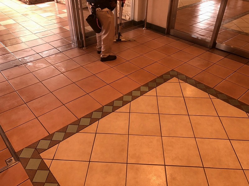 洗剤塗布→高圧洗浄→自然乾燥または床面スクイジー仕上げ という仕様どおりの作業を行いました。