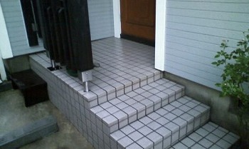 アプローチ部分にコケも生えておりますが、エアコンクリーニングをした後の流れで、ある程度の圧がありますのでエアコンポンプでコケも落しました。一通りタイルのコケや泥汚れを落としたら、酸を噴霧漬け置きしていきます。