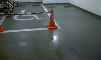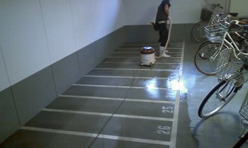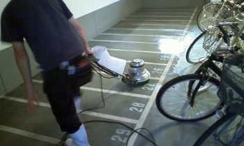 3階駐輪場部分洗浄風景です。右写真はバキューム作業中です。