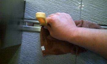 自動扉レールのバキューム後の拭き掃除中と仕上がり