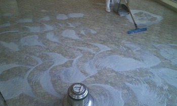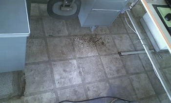 剥離剤をよーくワックスに浸透させて、一度固まりかけたワックスを水で溶かしていくように洗っていきます。タイネックスブラシじゃなかったらパットの目詰まりで作業不能になるでしょうね(苦笑)って汚水の量が多すぎますね(焦っ!)