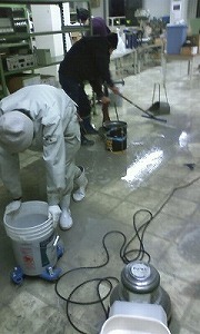 表題のガチ剥離って・・・そうです、施しようがなくなってビルメンさんが塗りに塗り重ねた床を剥離洗浄するときに用いられる掃除屋さんの造語です。さらりと剥離洗浄・さらりとした汚水は望めないベットベットのガチ剥離の事です。