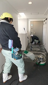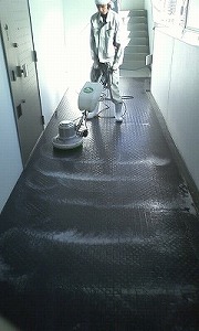 内容としては、床だけではなくて、共用廊下の照明・インターフォンや表札や玄関扉などの拭き掃除・エレベーター内ヘアラインステンレス部分の磨き・エレベータ内ゴムマット清掃です。