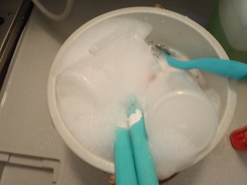 そして、作業が終わったら塩素にてその場で、ブラシやパットを消毒していきます