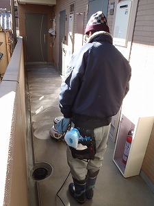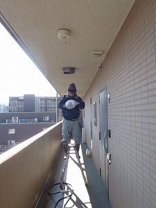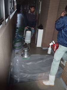共用廊下の床清掃作業中