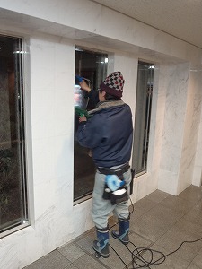 各階にある雨よけの曇りガラスを作業いたしました