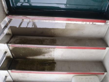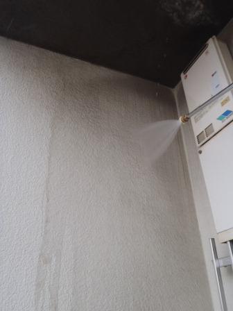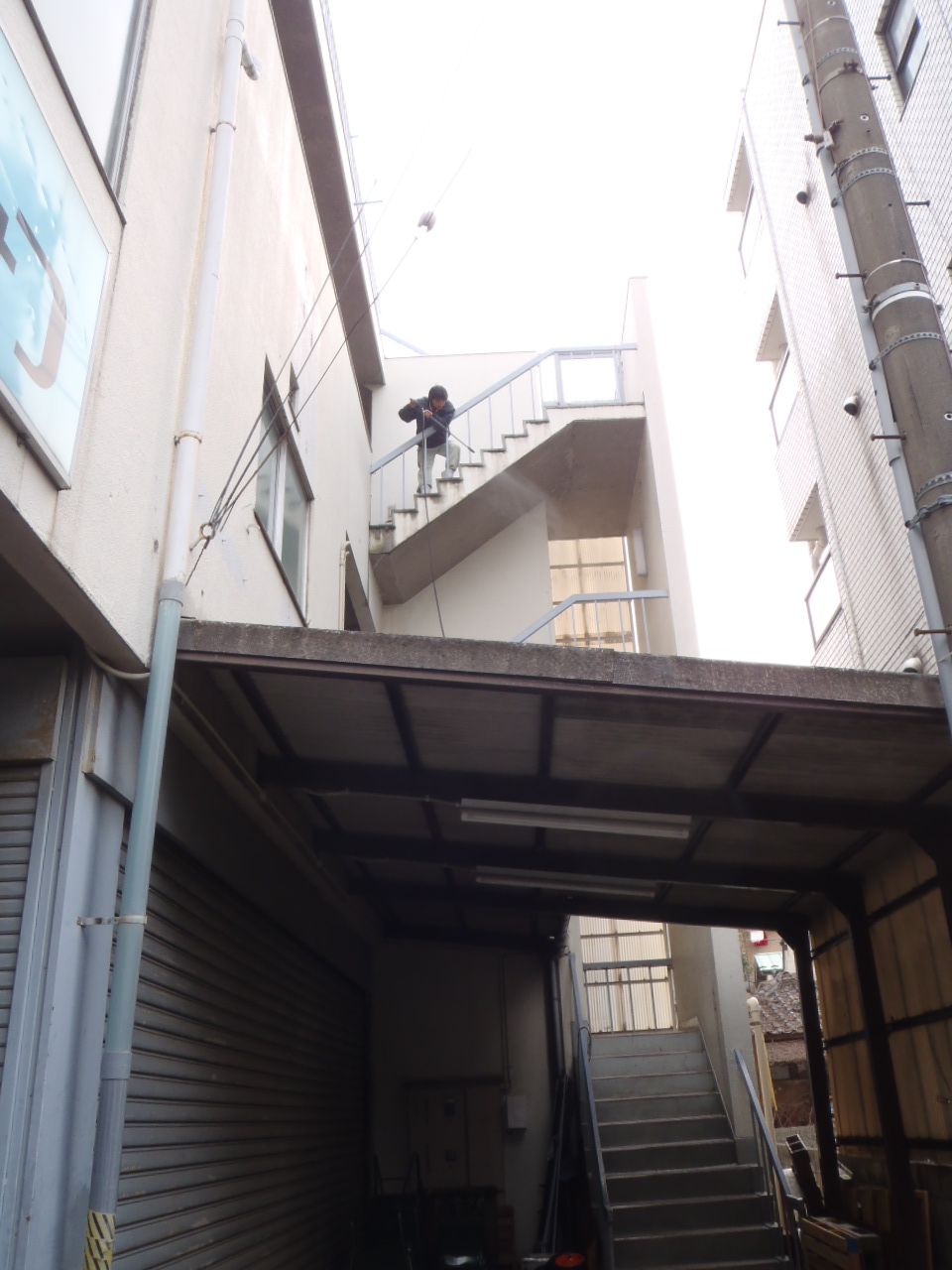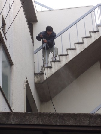マンションの共用部分の壁面も高圧洗浄していきます
