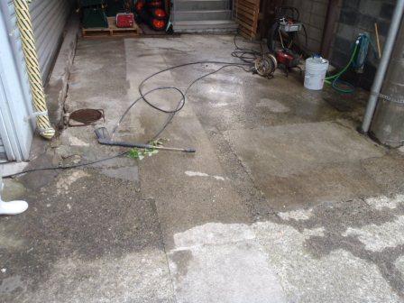 壁・床・犬走りの千㎡は超える面積と今まで何十年清掃をしていなかった汚れをひたすら高圧洗浄していきます。