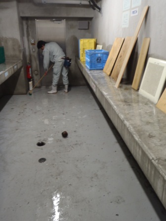 臭いを少しでも緩和させるために、ゴミ汁の染みついた板や壁・床を洗浄していきます