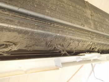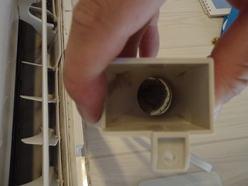 真横から見た洗浄前のドレインパンと送風ファン周り