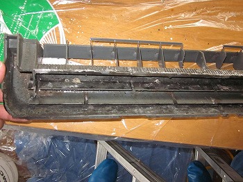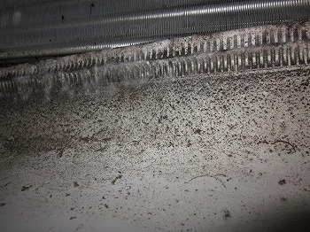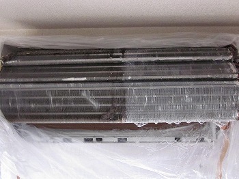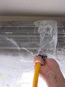 いつもの様にアルミフィンの裏側から手前方向に洗剤を打ち貫いて洗浄していきます