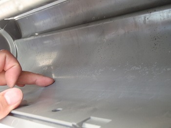 フィン上部裏側に洗剤の流し残し(ファン周りに白い水滴がこびりついているのとラムダ側のドレインレールからの洗剤たれ染み)