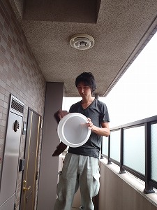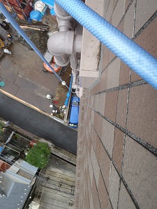 水栓が1階にあるので10階まで細いホースで引っ張ります