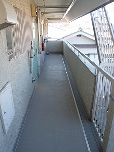 オーナーさまの悩んでおりました、廊下天井の砂ほこりや蜘蛛の巣・壁の高圧洗浄、床のポリッシャー掛けを行い建物のリフレッシュをはかりました。