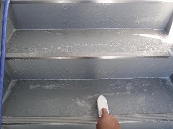 1日目・・・12階~1階までの階段洗浄と床洗浄、3F駐輪場・1Fエントランスの洗浄及びバキューム、目皿の清掃、照明や扉類の拭き掃除