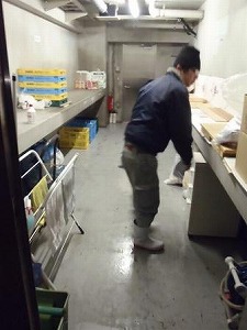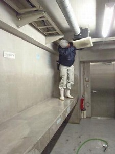 寒い中、ひたすら腰壁を洗浄する掃除屋。