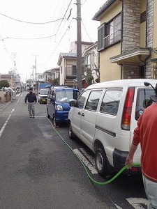 新人の溝江と洗車をしていたところ、タチも合流して、洗車集団になりました。