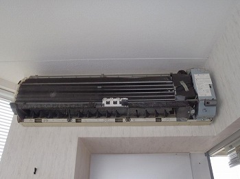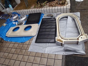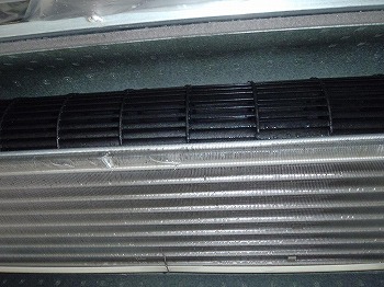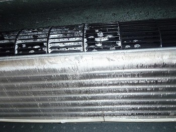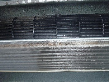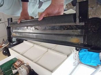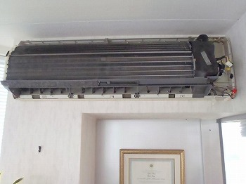 普通の家庭よりも長い業務用仕様のものですが、通常料金作業です。本当は完全分解をしたいところでしたが、複雑に絡んだ銅管に融着テープその下にビスがあり完全分解不能の機種でした。残念ではありましたが、通常分解で出来る限り綺麗にしていきました。