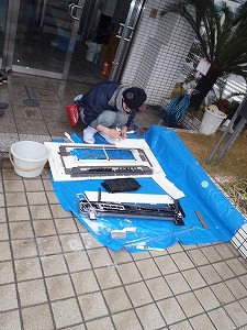 作業時に部品に傷がつかないように、ブルーシートを敷いて作業しております