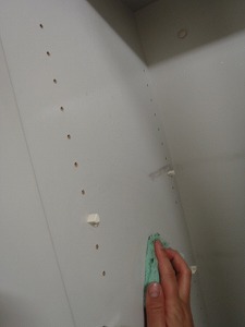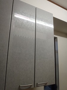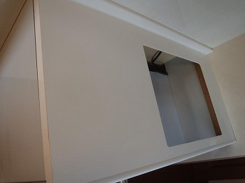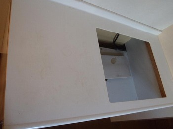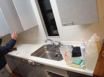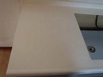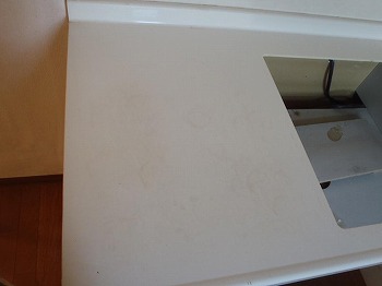 人工大理石のキッチン天板はすぐに艶が出てしまいますが、均一につや消しに仕上げていきました。