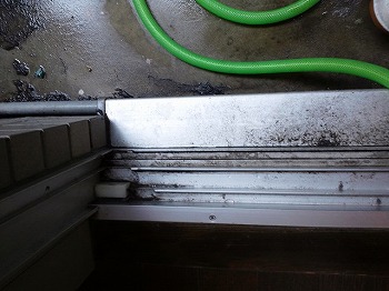 サッシのレール下のこの部分まで丁寧にブラシを入れていきます