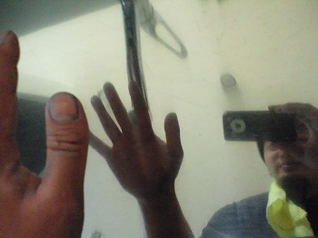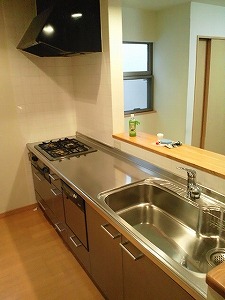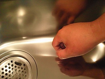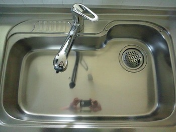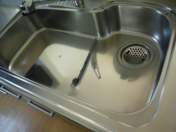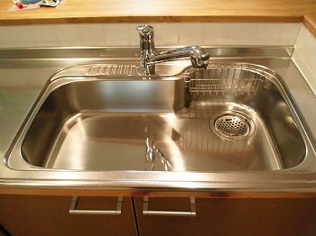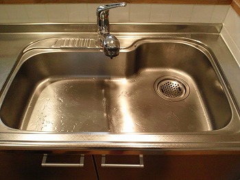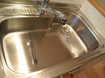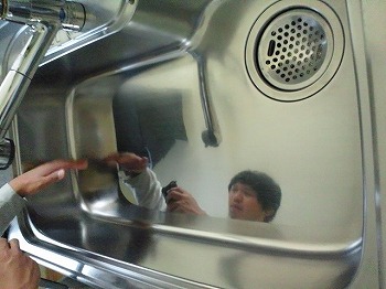 天井のライトの反射でシンクの撮影が困難なので、照明を消すと周りが写り込むように見えます