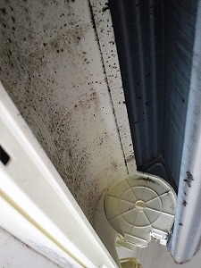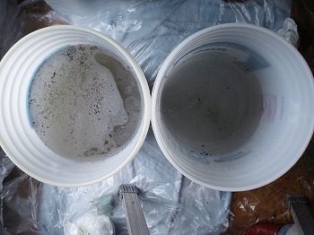 ドレインパンの洗浄前と汚れの差と洗浄後です