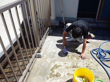 ルーフバルコニーが結構広かったのですが、ハンドブラシとデッキブラシで擦り落とします。高圧は環境的に選択が出来ず(泣) ※風が強く最上階ルーフバルコニーのため下の階のルーフバルコニーや洗濯物に汚水が跳ねる可能性があったため。