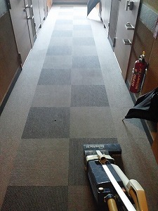 作業内容・・・共用廊下10階分のカーペット洗浄と扉類の拭き掃除、1階エントランスと風除室の床清掃と拭き掃除、マットの洗浄