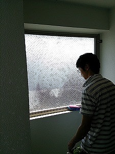 エレベータ横の曇りガラス内側の作業の様子です。