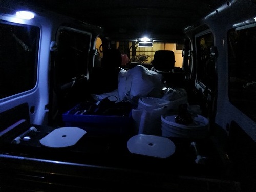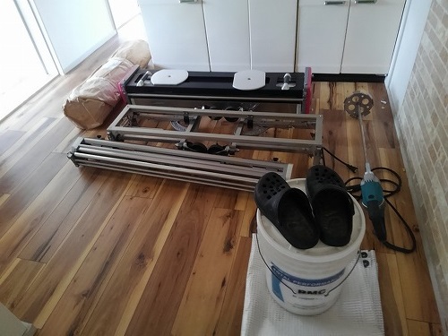 えっちらほっちらと、壁紙の道具を現場へ運びます