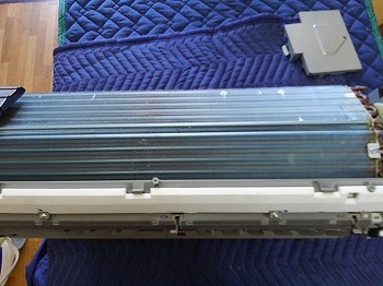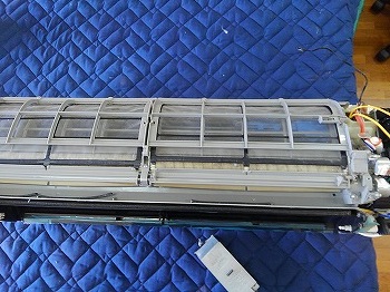 AN56PRP-Wの内部は、重厚なアルミフィン(4重構造)と、一体型で分割タイプのドレンパンを有しておりオーバーホールのやりがいのあるエアコンです。