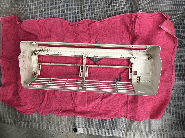 ボロのバスタオルは、エアコンの部品が傷つかない様に引いて作業しております。
