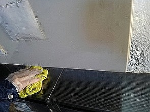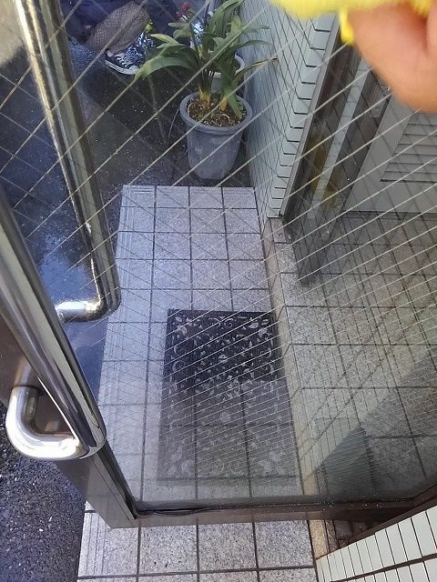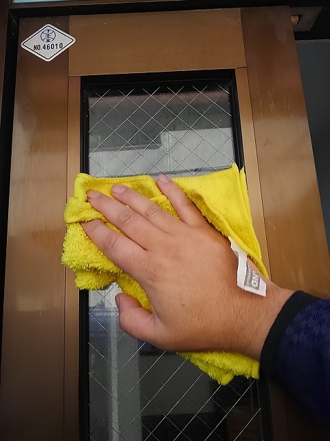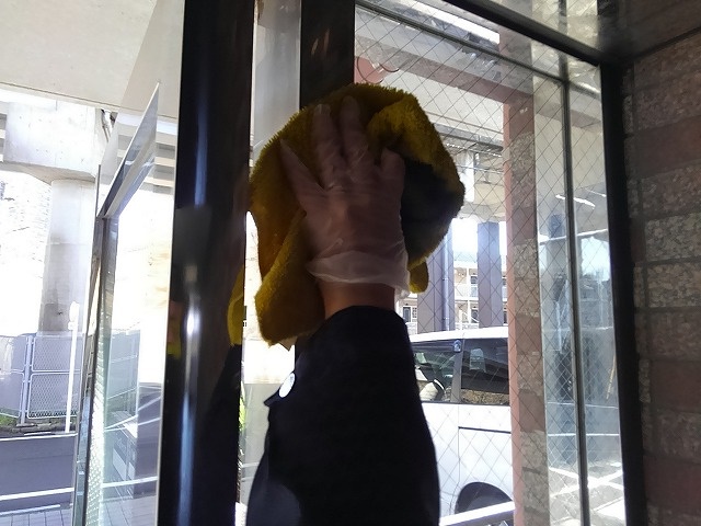 入口等のガラスを拭きます。