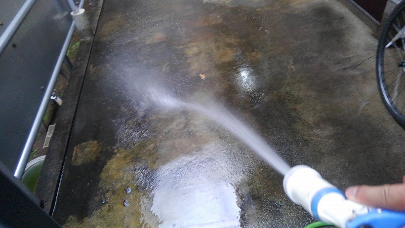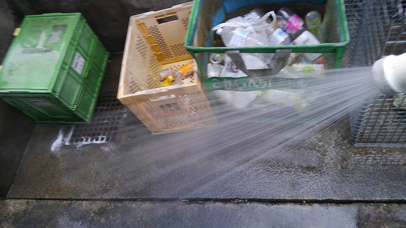 消毒剤として塩素を散布して漬け置きして、15分置いてから散水洗浄しております。