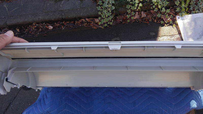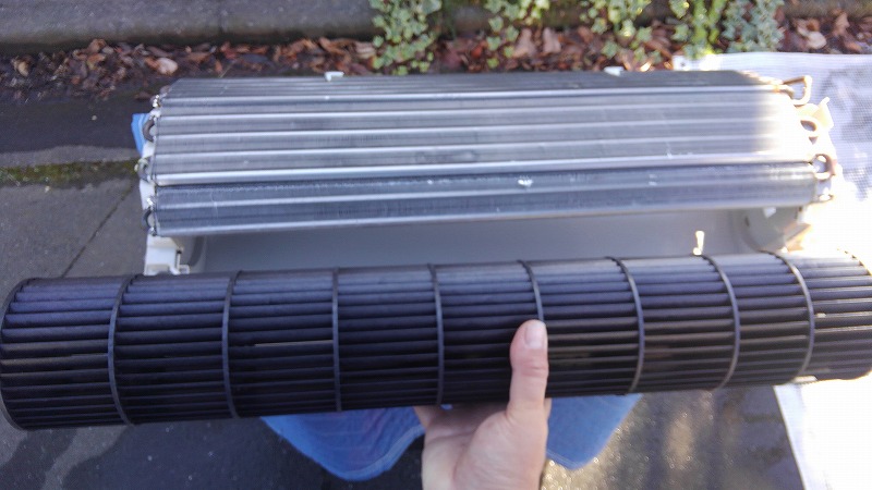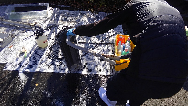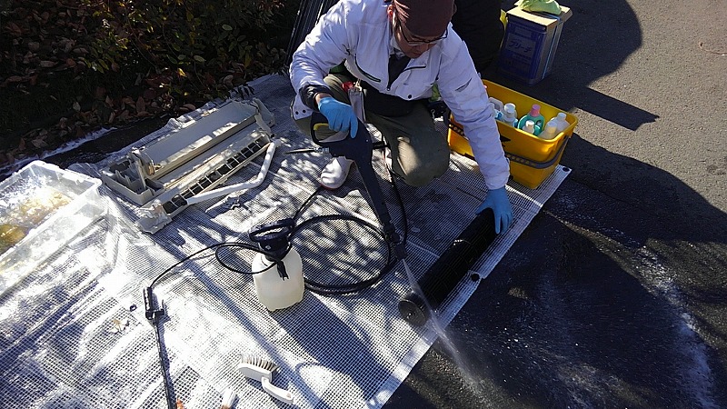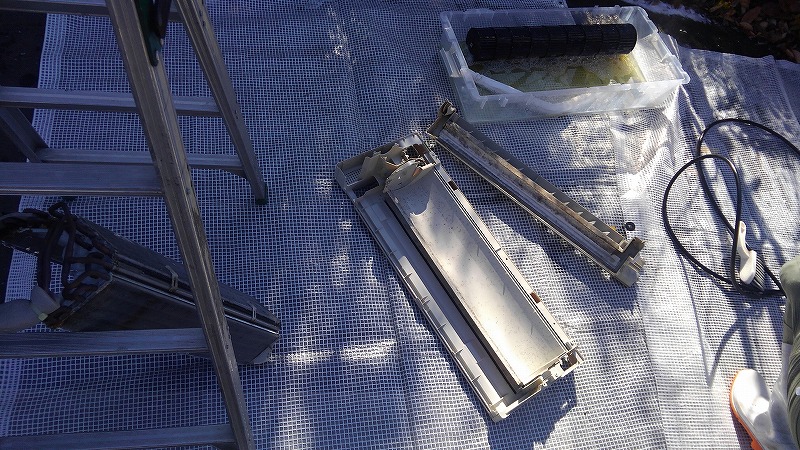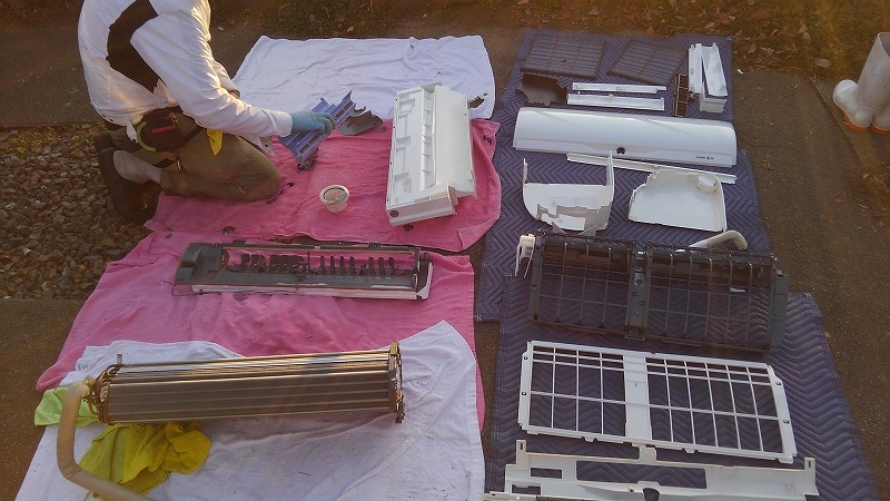 かなりのカビ&ホコリエアコンでしたので、外に分解台を設けて作業しました。