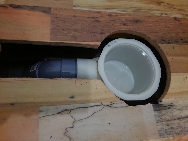 排水口の位置を洗濯機の後ろ側にしたいとの事で、床にクッションフロアを張った後に穴あけ加工を行いました。