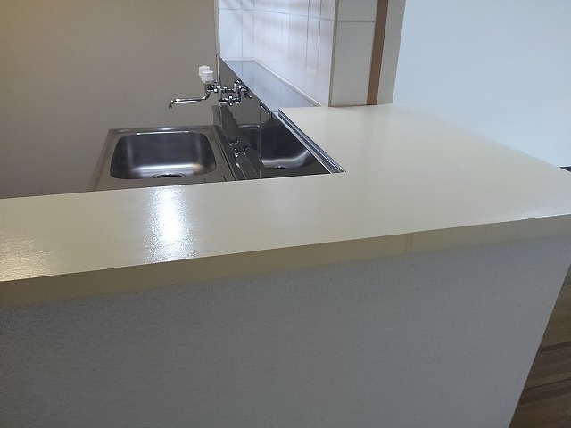 3層塗装の仕上りとキッチンカウンター下の壁紙仕上り。