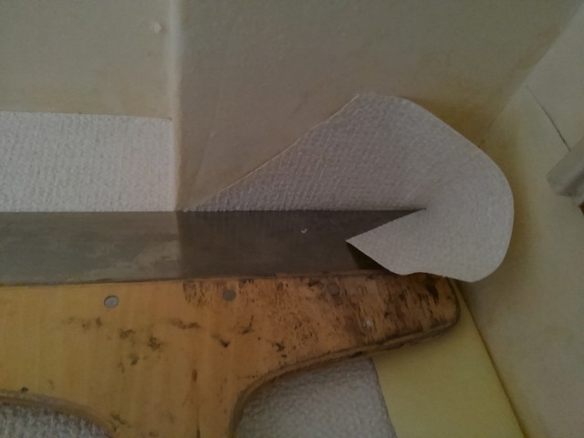 使いならした1.2mmの地ベラでのカット・スライド切りや、入角部分でボードとの隙間が空いている部分は樹脂ベラ等で厚みを替えリズム良くすすめました。