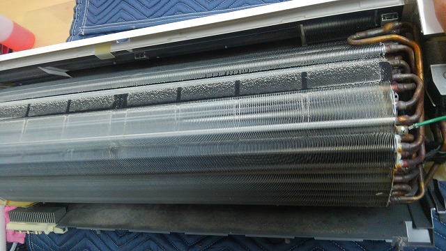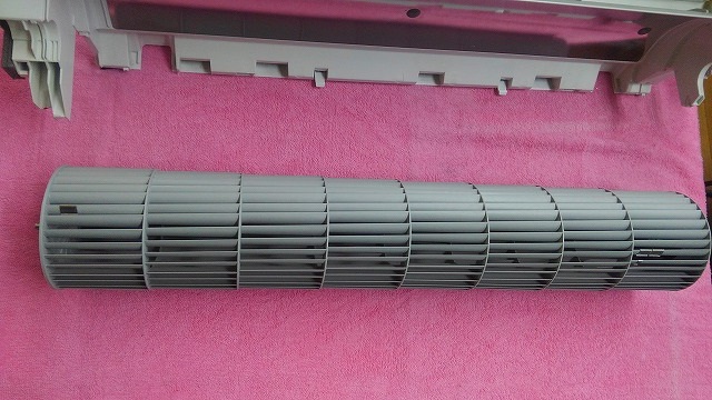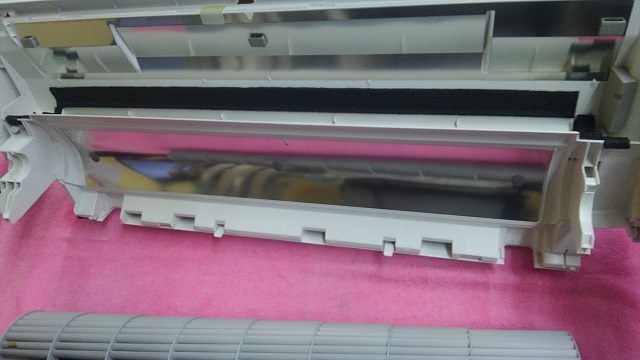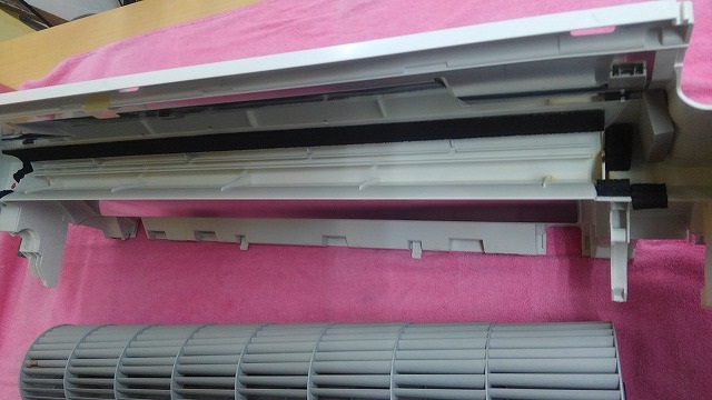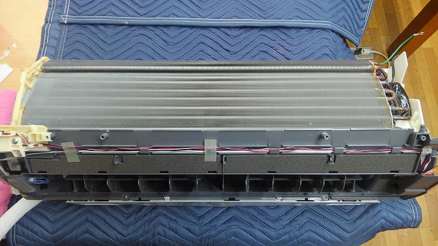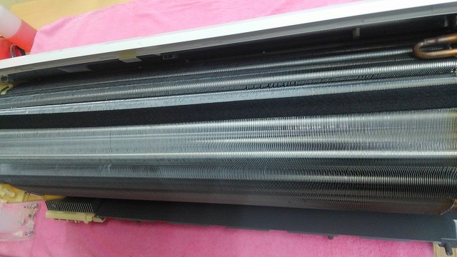 アルミフィンにドレンパンが深く被っているため取り外しが容易ではない機種です(構造から無理にドレンパンを取り外すとアルミが痛むと思います)。