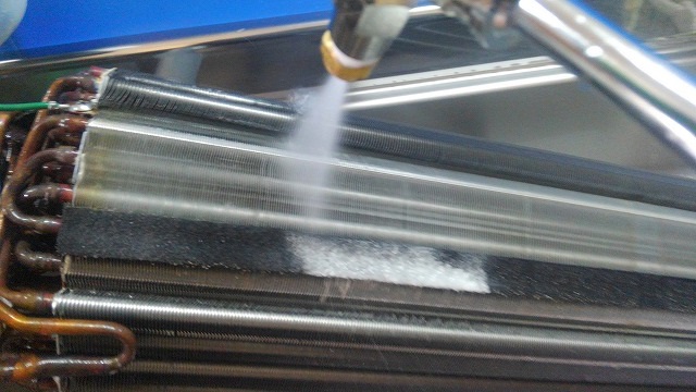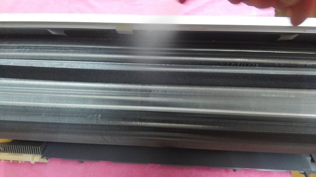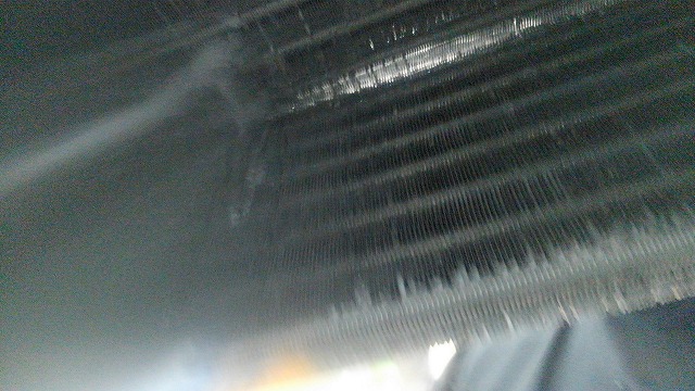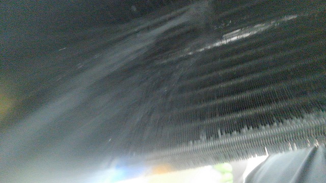 お察しかもしれませんが当店の高圧洗浄機の場合は色々と工夫しているのでこれだけの貫通力があるのですが、通常他社様の壁掛けのエアコン洗浄機では低圧低水量なのではアルミは貫通しないので、このアングルでの撮影は無理です。