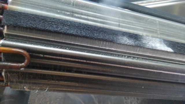 アルミフィンを取り外して壁側と手前側のドレンパンを同じ定点から撮影したもの。