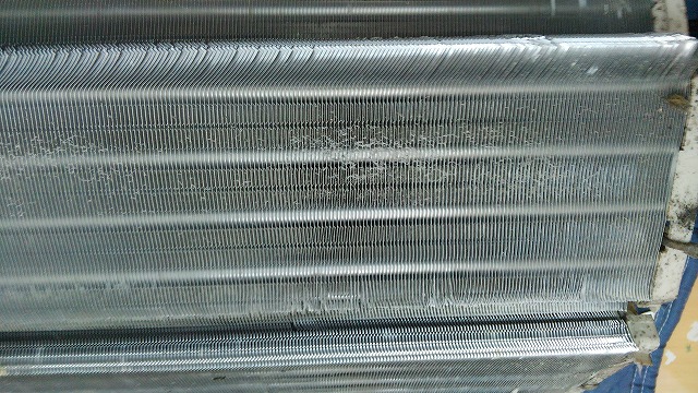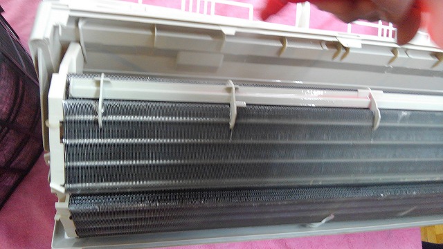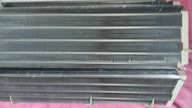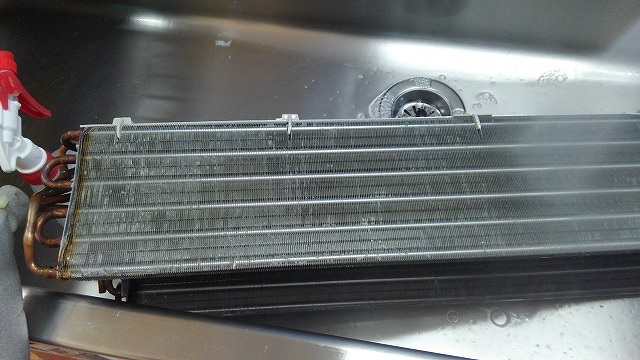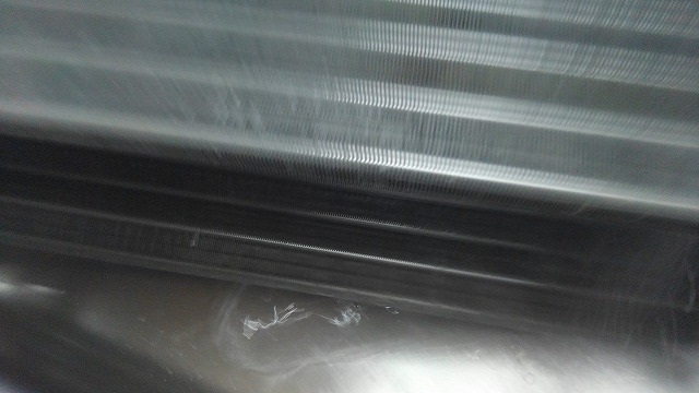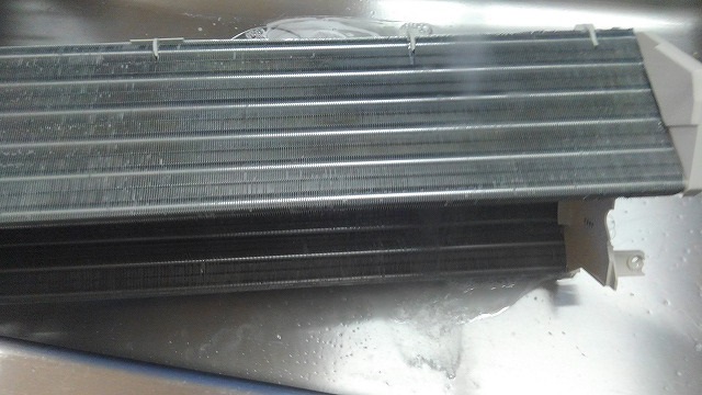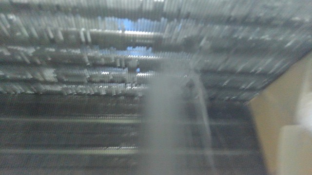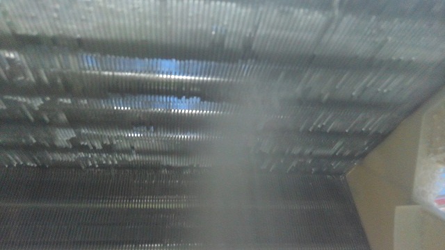 お察しかもしれませんが当店の高圧洗浄機の場合は色々と工夫しているのでこれだけの貫通力があるのですが、通常他社様の壁掛けのエアコン洗浄機では低圧低水量なのではアルミは貫通しないので、このアングルでの撮影は無理です。