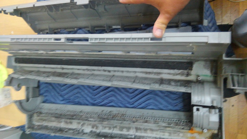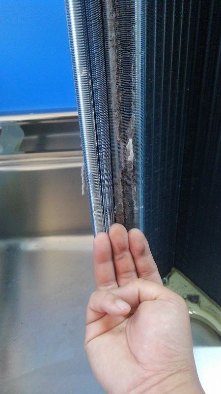 アルミフィンの厚みが分厚すぎて壁掛けでのエアコンクリーニングで使う普通高圧洗浄では打ち抜けないんじゃないかな?と完全分解洗浄を行う当店としては答えを出しておりました。