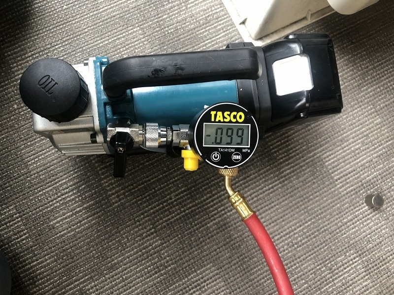 このまま配管を接続すると空気とガスが混じりあって性能劣化するので、配管の空気を外に出す【真空引き】という工程を行います。