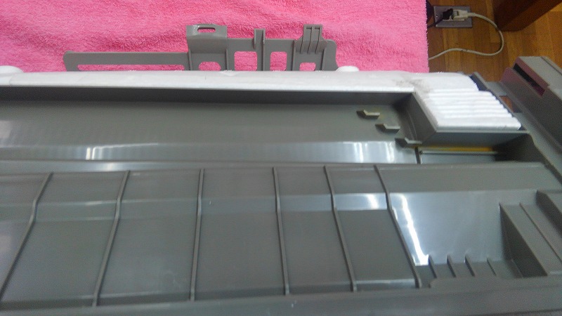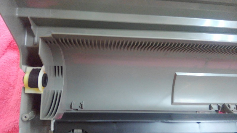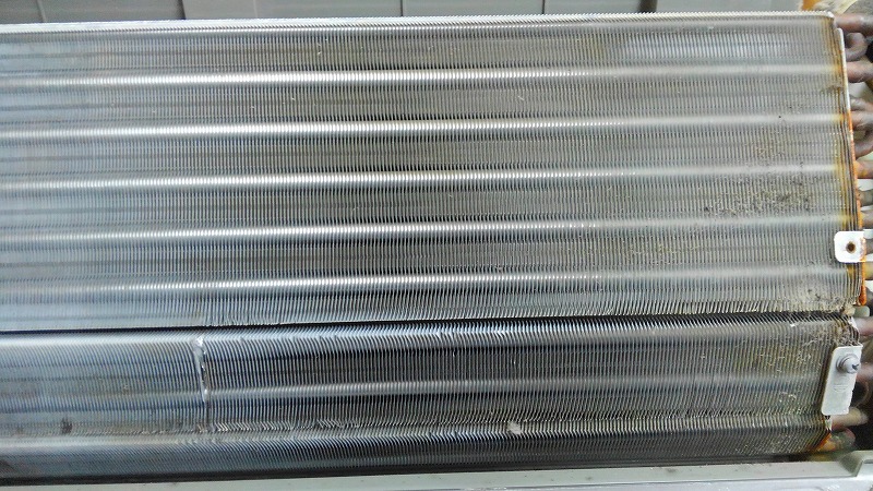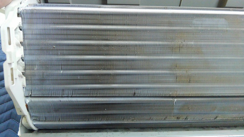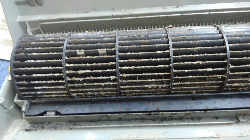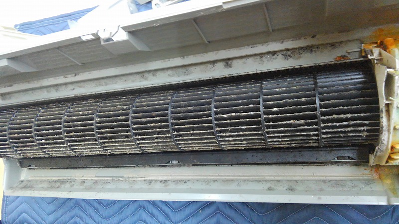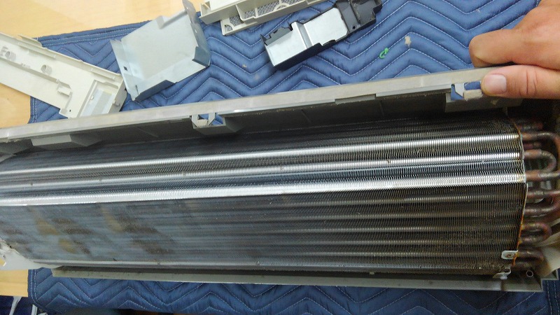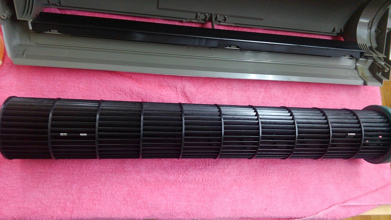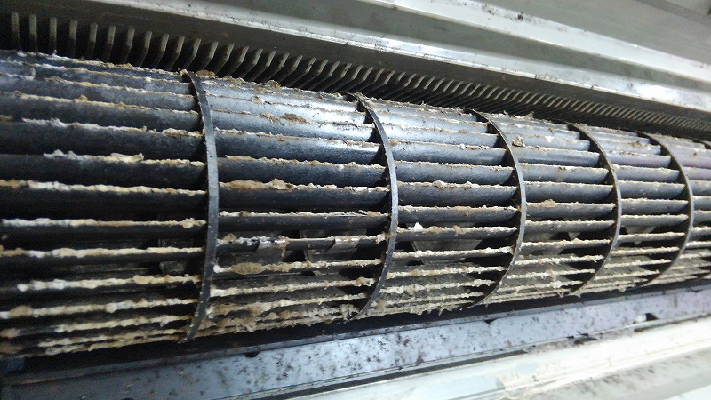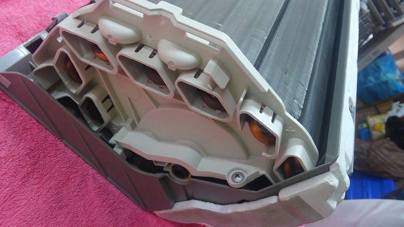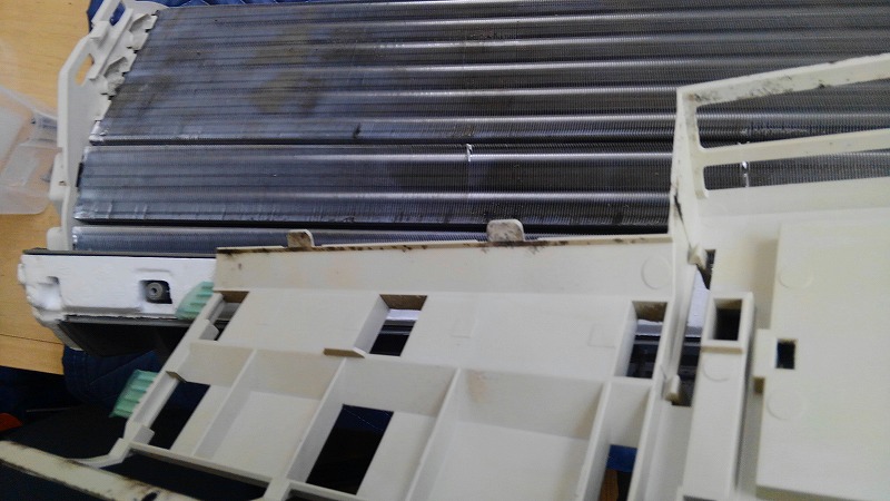 アルミフィンを取り外して一体型のドレンパンとファンの汚れが写った画像。
