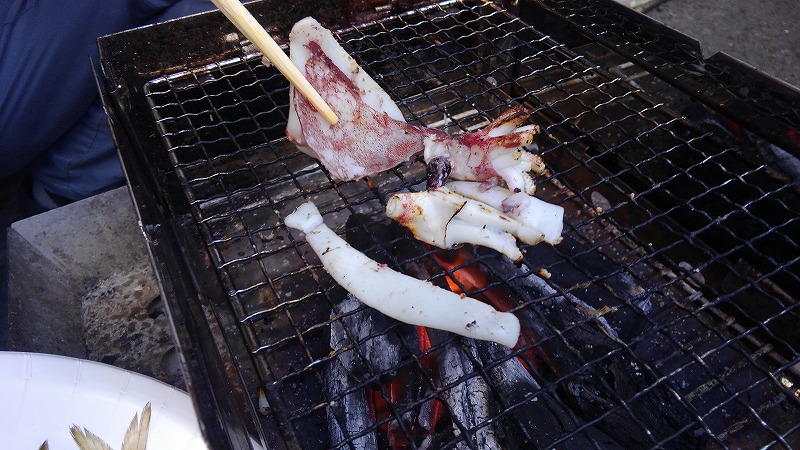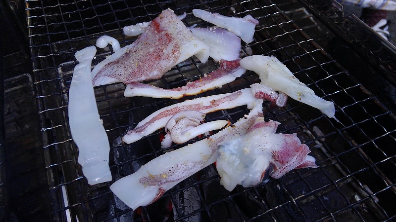 大川とその日に釣ったアジとイカを炭火で網焼きに。