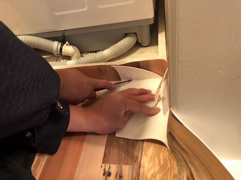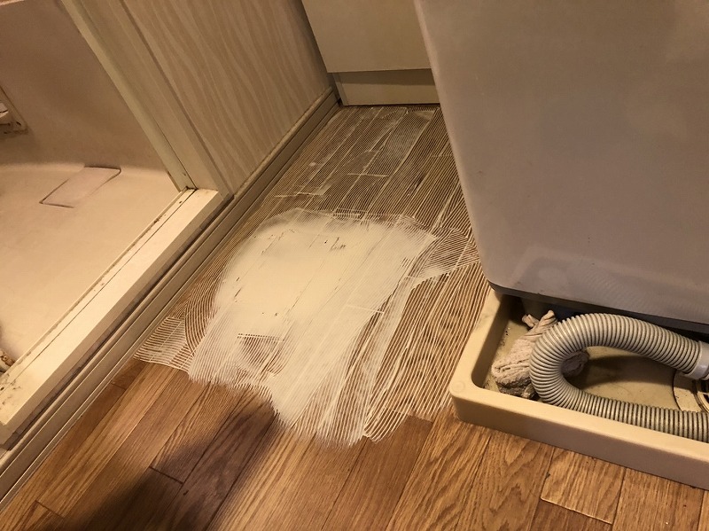 粉塵が出るため上張りで張りますと住人に説明のうえ、ボンドを塗っていきます。