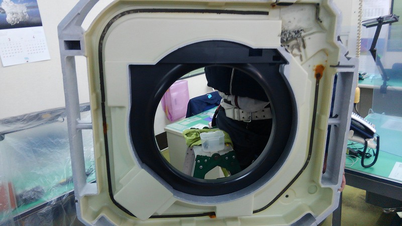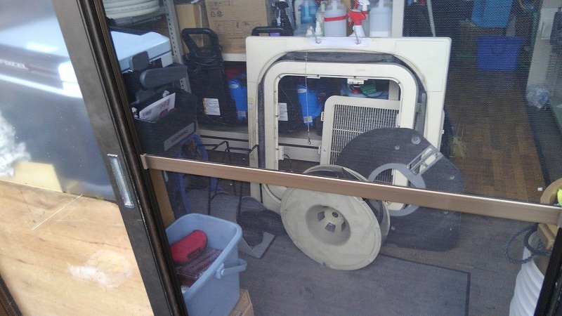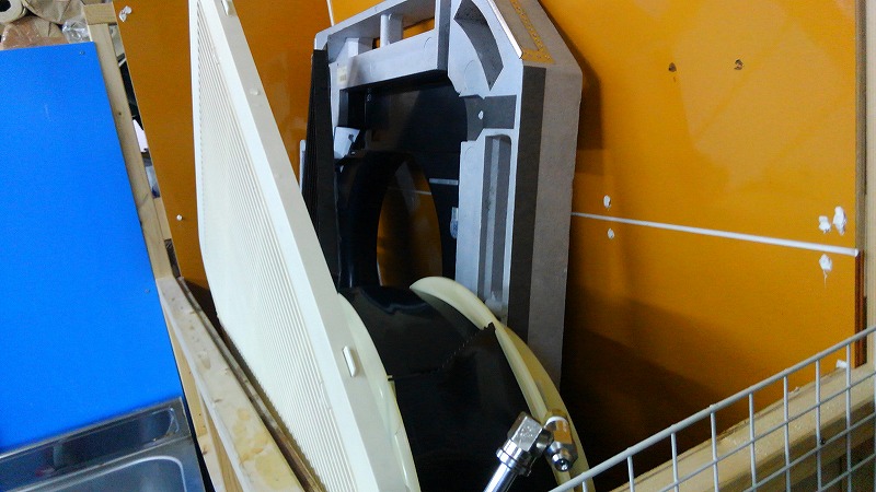 外でパーツを洗うのですが、この日に限って強烈な雨だったのでパーツ類を営業所内に持ち帰って洗浄する事にしました。