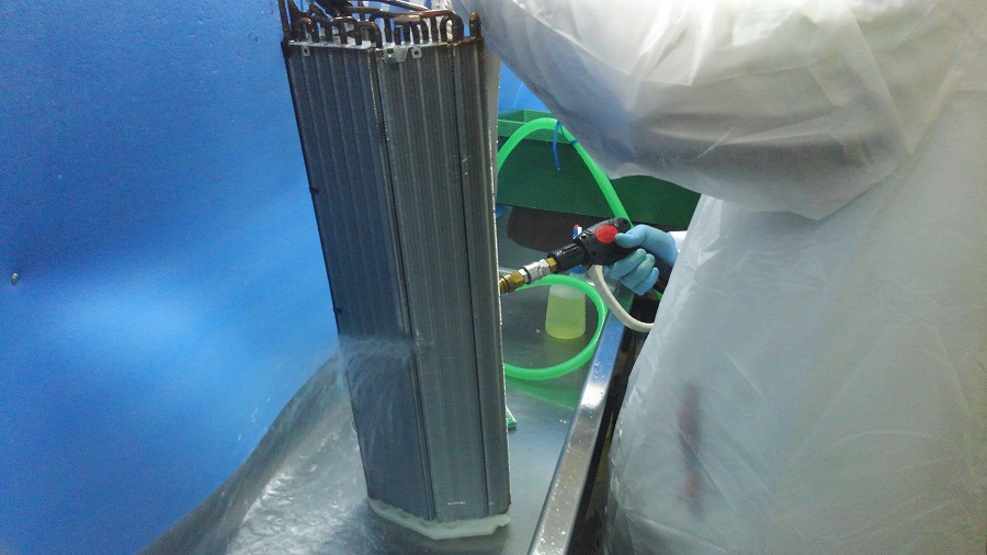 エコ洗剤を満遍なくいきわたらせて、高圧洗浄。